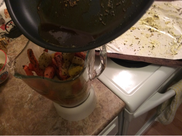 Pull the baking tray out and place the cooked veggies into the blender with the lentils. Add the coconut milk and your heated spices. Then blend up until creamy-smooth...this will depend on how nice your equipment is! Mine is standard Canadian Tire-available equipment and it was about 3 minutes on low.